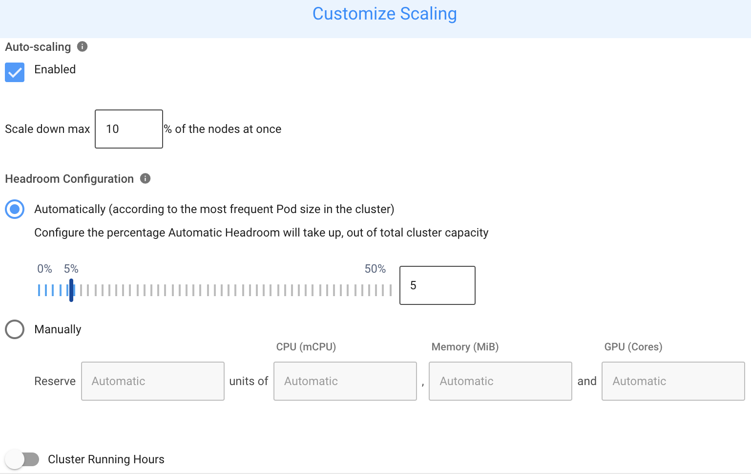 cautionUnder normal operation, Auto-scaling should be enabled, and it is not recommended to disable this function. When Auto-scaling is disabled, Ocean does not scale up or down and cannot maintain headroom. In addition, the Cluster Shutdown Hours feature will not work properly when scaling the cluster back to its desired state.