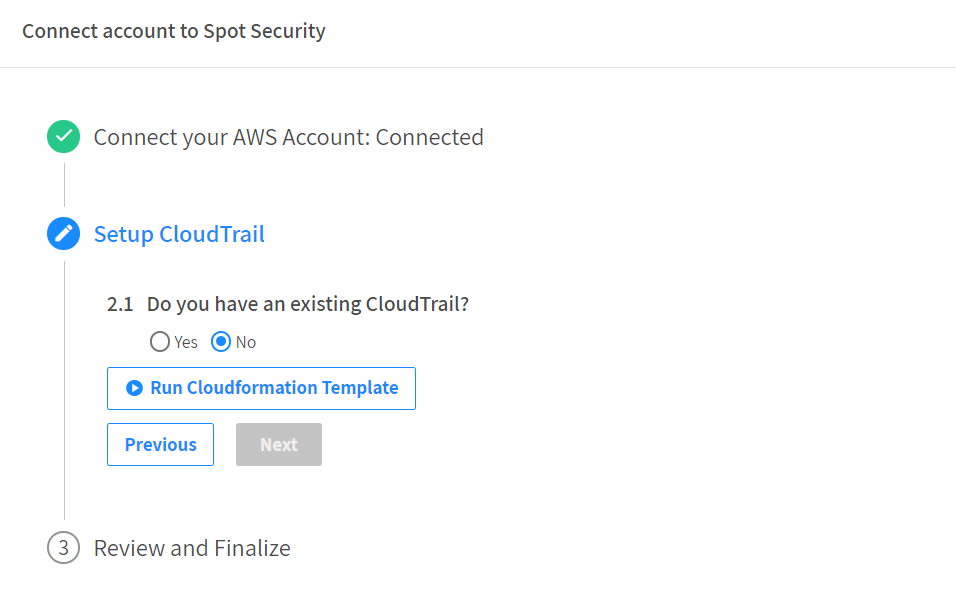 1. If you don’t have a CloudTrail account, select No and click Run CloudFormation Template which will help you set up CloudTrail.